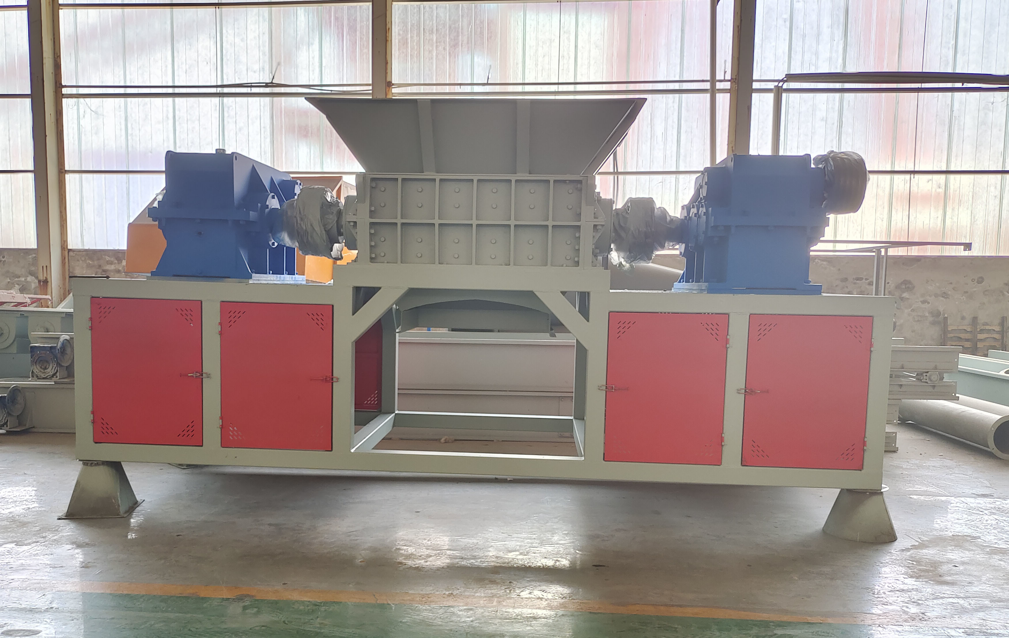 Cette déchiqueteuse à double cisaillement n'a pas d'unité d'écran. Après que le matériau est introduit dans la trémie, le matériau est manipulé à l'aide de deux lames tournantes, puis directement déchargé.