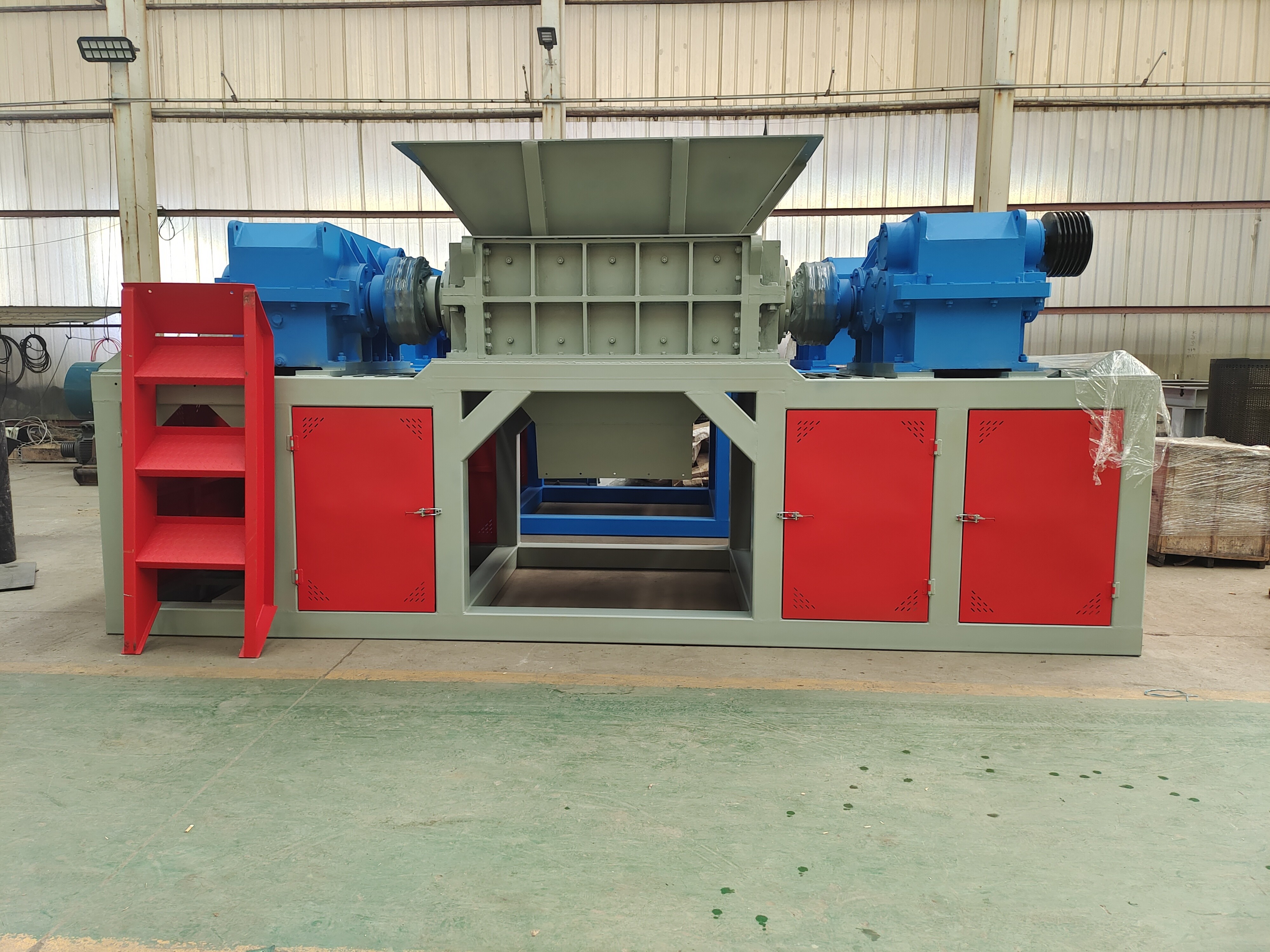 Cette déchiqueteuse à double cisaillement n'a pas d'unité d'écran. Après que le matériau est introduit dans la trémie, le matériau est manipulé à l'aide de deux lames tournantes, puis directement déchargé.